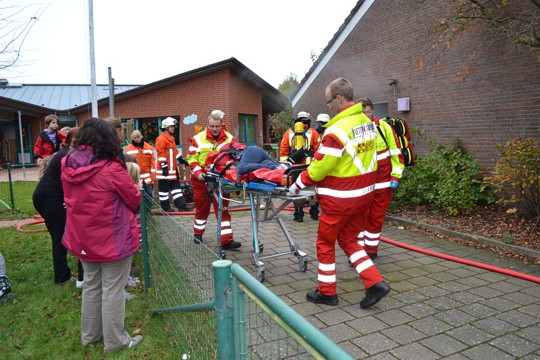 Feuerwehrleute mit Atemschutzgeräten sprangen aus den Fahrzeugen, Schläuche wurden gerollt und Material zur Menschenrettung ausgeladen. Die Rettungsassistenten des ASB standen vor Ort bereit, um eine verletzte Person zu versorgen. Eine aktive Kameradin moderierte dabei die Übung, um den aufmerksam zusehenden Kindern die Handgriffe im Einsatz zu erklären.
