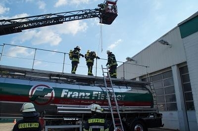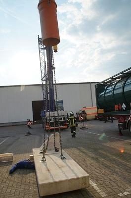 Als Herausforderung gestaltete sich die Rettung des verunfallten Mitarbeiters, der in dem Tankauflieger gefallen war. Auch hier konnten die Einsatzkräfte nur unter schwerem Atemschutz vorgehen. Unter Zuhilfenahme der Drehleiter gelang es die Person aus seiner misslichen Lage zu befreien.