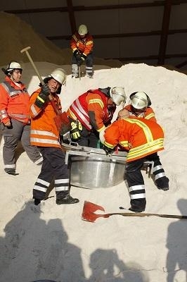Noch während der Einsatzbereich Werkstatt abgearbeitet wurde, kam die Meldung, dass ein Mitarbeiter in einem Lagerbereich von Salzmassen verschüttet wurde. Ein weiterer Mitarbeiter wurde durch die Masse an Salz unter einem Betonteil eingeklemmt. Hier setzte die Einsatzleitung die Ortsfeuerwehren Holtorf und Leeseringen ein. Zur Unterstützung der Kräfte wurde der Kran der THW Bundesschule Hoya eingesetzt. Mit speziellen Abstützringen (Karlsruher Ringe) und Schaufeln bahnten sich die Einsatzkräfte den Weg zu dem Verschütteten und retteten diesen. Der Kran des THW hob zwischenzeitlich das Betonteil an, so dass auch diese Person schnell aus seiner unglücklichen Lage befreit werden konnte.