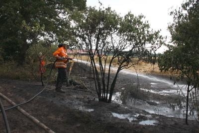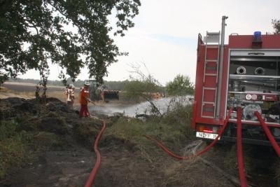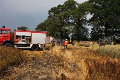 Husum. Der Fahrer des Mähdreschers war geschockt und mit den Nerven am Ende. Nach seinen Angaben war ein großer Stein in das Mähwerk geraten und hatte einen enormen Funkenflug erzeugt. Sofort geriet ein noch nicht abgeerntetes Getreidefeld in Brand. Sein Versuch, den Brand mit seinem Pulverlöscher zu löschen, hatte wohl mehr symbolischen Charakter. Ortsbrandmeister Andreas Haake sah schon auf der Anfahrt die riesige Rauchwolke und ließ durch die Leitstelle 6 Feuerwehren mit wasserführenden Fahrzeugen alarmieren. Neben Husum kamen die Wehren aus Linsburg, Leeseringen, Langendamm und Landesbergen zum Einsatz. Sogar das Leeser Tanklöschfahrzeug musste mit ausrücken. Zwar gelang es, das Nachbarfeld und das angrenzende Gehölz zu retten, aber das brennende Feld selbst musste aufgegeben werden. Sengende Hitze und die Notreife des Kornes förderten die blitzartige Ausbreitung der Flammen. Gewittrige Schauer in Leese und Landesbergen kamen den über 50 Wehrleute in Husum nicht zu Hilfe. Als nach anderthalb Stunden "Feuer aus" gemeldet werden konnte, waren die Einsatzkräfte erschöpft, aber zufrieden.
