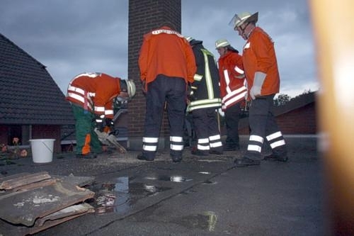 Leeseringen. Am Samstagabend bemerkte ein älteres Ehepaar in der Weserstraße eine starke Rauchentwicklung auf dem Dach des von ihnen vermieteten Nachbarhauses. Die Mieter hatten wegen des grausigen Augustwetters den offenen Kamin in Betrieb genommen. Aus noch ungeklärter Ursache geriet das Dach darüber einschließlich der Korkisolierung in Brand. Die Leeseringer Feuerwehr rückte unter Leitung von Reinhard Menze mit 20 Einsatzkräften an. Mit einer Kettensäge musste das Dach geöffnet werden. Die Isolierung wurde herausgezogen und mit mehreren C-Rohren abgelöscht. Das aufziehende Gewitter und der einsetzende Starkregen erschwerten die Arbeit. Mit einer Wärmebildkamera wurde nach versteckten Glutnestern gesucht. Nach gut 2 Stunden war die Arbeit beendet. Ohne die Aufmerksamkeit der Vermieter wäre der gesamte Dachstuhl in Brand geraten.