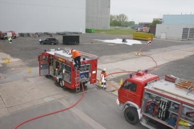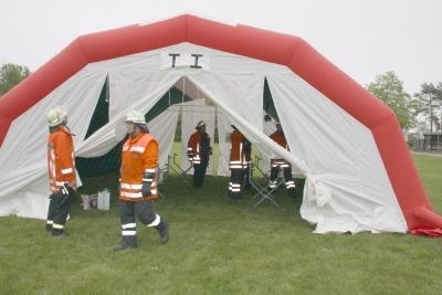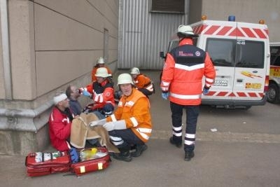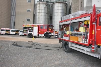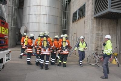 Landesbergen. Am Dienstagabend um 16.57 h riefen die Sirenen die Feuerwehren von Landesbergen, Leese, Estorf und Leeseringen zum Einsatz. Gemeldet wurde ein Mittelbrand im Kraftwerk Landesbergen, Alarmstufe 2. Schon auf der Anfahrt waren dunkle Rauchwolken über dem Werksgelände zu sehen. Vor einer großen Halle waren 2 offene Brände entstanden. Die Werksmannschaft des Robert Frank Kraftwerkes, das von der norwegischen Firma Statkraft betrieben wird, konnte die Feuerwehren routiniert einweisen. Schnell stellte sich heraus, dass die Feuerbekämpfung ersteinmal zweitrangig wurde. 12 Personen einer Besuchergruppe waren mit ihrem Führer durch eine Gasexplosion schwer verletzt worden und warteten in einer total verqualmten Halle auf Rettung. Sofort wurde die Alarmstufe durch den ersten Einsatzleiter Sven Schlüter erhöht und die Feuerwehrleute rückten unter Atemschutz zur Menschenrettung vor. Die Leitstelle löste den so genannten ManV II Alarm aus. Das bedeutet: Massenanfall von 10 bis 19 Verletzten. Dieser Alarm setzt Notärzte, Rettungssanitäter und die entsprechende Ausrüstung in Marsch. Ein großer Abrollbehälter Rettung wird von Nienburg aus zur Einsatzstelle gefahren. Dieser Container enthält 3 aufblasbare Rettungszelte, die wie ein kleines Lazarett funktionieren. Von Heizung bis zu Instrumenten für die Erstversorgung von Brüchen ist alles vorhanden. Die Fachleute und Notärzte der Schnellen Einsatzgruppe des Roten Kreuzes, des Arbeiter Samariter Bundes und der Johanniter stellen die Erstversorgung der Patienten sicher. Das Technische Hilfswerk übernimmt die Stromversorgung und leistet Aufbauhilfe. DRLG und ABC - Zug rücken zur weiteren Unterstützung aus. Gleichzeitig wurden weitere Feuerwehren der Samtgemeinde Landesbergen, aus Nienburg, Stolzenau und dem Raum Steyerberg angefordert.