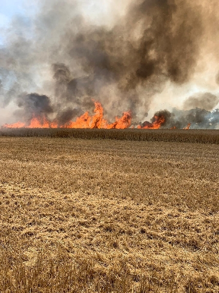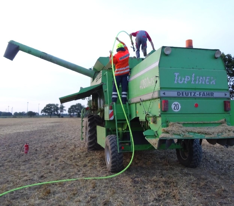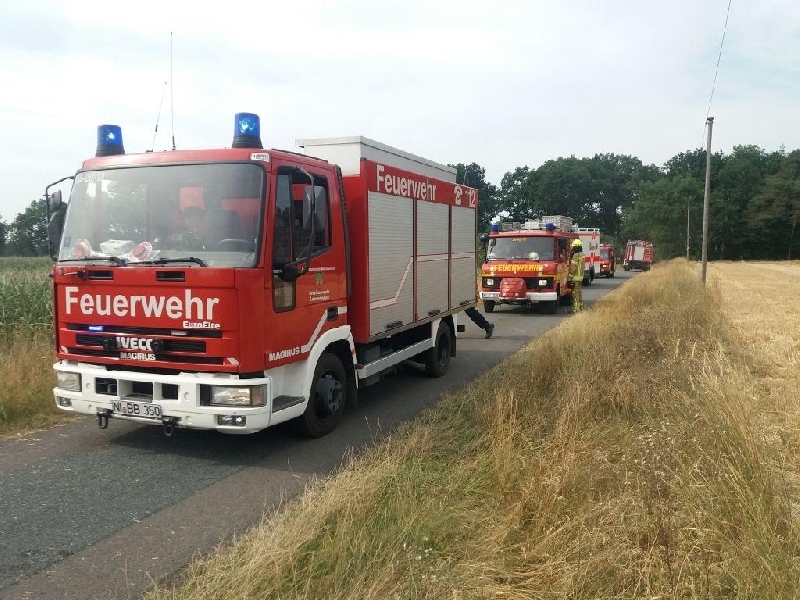 (Leese) Gerade als unsere Einsatzkräfte die Einsatzbereitschaft wieder hergestellt hatten kam der nächste Alarm. In Leese brannte ebenfalls ein Kornfeld. Ursache auch hier ein technischer Defekt an einer Erntemaschine. Hierher wurden die Wehren aus Leese, Landesbergen, Nendorf-Frestorf, Stolzenau und Leeseringen entsendet. Durch das schnelle Eingreifen der Feuerwehren sowie die gute Unterstützung umliegender Landwirte, die sofort mit mehreren Grubbern zur Stelle waren, konnte der Schaden hier auf ungefähr einen Hektar Fläche begrenzt werden.