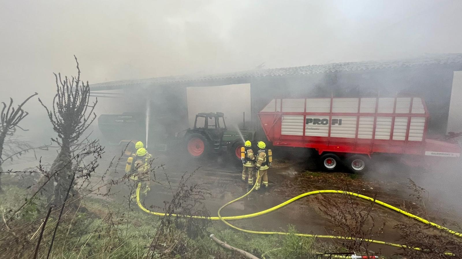 (Schessinghausen) Ein ausgedehnter Scheunenbrand ereignete sich in den frühen Morgenstunden des heutigen Sonntags. Aus bisher ungeklärter Ursache geriet eine etwa 20x40 Meter große Scheune eines landwirtschaftlichen Betriebs gegen 6:30 Uhr in Brand. In dieser waren hunderte Quaderballen eingelagert, die neben mehreren landwirtschaftlichen Maschinen, die ebenfalls in bzw. vor der Halle standen, ein Raub der Flammen wurden. Mit dem Alarmstichwort „Feuer landwirtschaftliches Anwesen mittel“ wurden zunächst die Wehren Schesssinghausen, Husum, Groß Varlingen, Bolsehle, Leeseringen, Langendamm und Nienburg sowie die ELO der SG Mittelweser alarmiert. Bereits auf der Anfahrt war ein großer Feuerschein zu sehen. Vor Ort galt es zunächst, eine Brandausbreitung auf einen in unmittelbarer Nähe stehenden Stall, in dem sich neben weiteren Strohballen auch eine Großzahl von Kühen befanden, zu verhindern. Dies gelang durch eine umgehend errichtete Riegelstellung. Probleme bereitete zunächst die Wasserversorgung an der Einsatzstelle, da sehr große Mengen an Löschwasser benötigt wurden. Diese wurden zunächst im Pendelverkehr durch mehrere wasserführende Fahrzeuge an die Einsatzstelle gebracht. Hierzu wurde die Wehr Landesbergen nachalarmiert. Da im weiteren Verlauf Schlauchleitungen über mehrere Kilometer zum Brandort gelegt werden mussten, kam auch der mit 2000m B-Schlauch bestückte Gerätewagen-Logistik der Feuerwehr Steimbke zum Einsatz. Das brennende Stroh musste dann aus der Scheune auf benachbarte Freiflächen verbracht werden, um es dort weiter ablöschen zu können. Hierfür wurde das THW mit einem Bagger sowie zwei Radladern hinzugezogen. Diese arbeiten zogen sich den ganzen Tag bis tief in die Nacht hin, weswegen am Nachmittag weitere Feuerwehren (Estorf, Brokeloh, Nendorf-Frestorf, Anemolter, Schinna) alarmiert werden mussten, um die bereits seit den frühen Morgenstunden im Einsatz befindlichen Kräfte abzulösen. Die FTZ war ebenfalls mit zwei Mitarbeitern vor Ort, um frisches Schlauchmaterial, zahlreiche Atemschutzgeräte sowie Kraftstoff für die Fahrzeuge zu bringen. Auch der Rettungsdienst und die Polizei waren vor Ort. Frische Einsatzkleidung für die eingesetzten Atemschutzgeräteträger kam von der Logistikgruppe der Feuerwehr Müsleringen-Diethe. Insgesamt waren bei diesem Großeinsatz mehr als 200 Einsatzkräfte beteiligt. Die Versorgung mit Getränken und einem Frühstück wurde durch den Verpflegungszug aus Wietzen durchgeführt. Die Löscharbeiten werden sich noch bis tief in die Nacht hinziehen. Zur Brandursache hat die Polizei die Ermittlungen aufgenommen. In den Abendstunden kam es dann noch zu einer schönen Geste eines Restaurantbesuchers. Direk Dervis, der am Abend als Gast im Schesssinghäuser „Vier Jahreszeiten“ war, war von der für ihn nicht selbstverständlichen Hilfsbereitschaft der vielen ehrenamtlichen Einsatzkräfte derart begeistert, dass er etwa 100 frisch gebackene Pizzen für die erschöpften Einsatzkräfte spendete, welche natürlich dankend angenommen wurden.