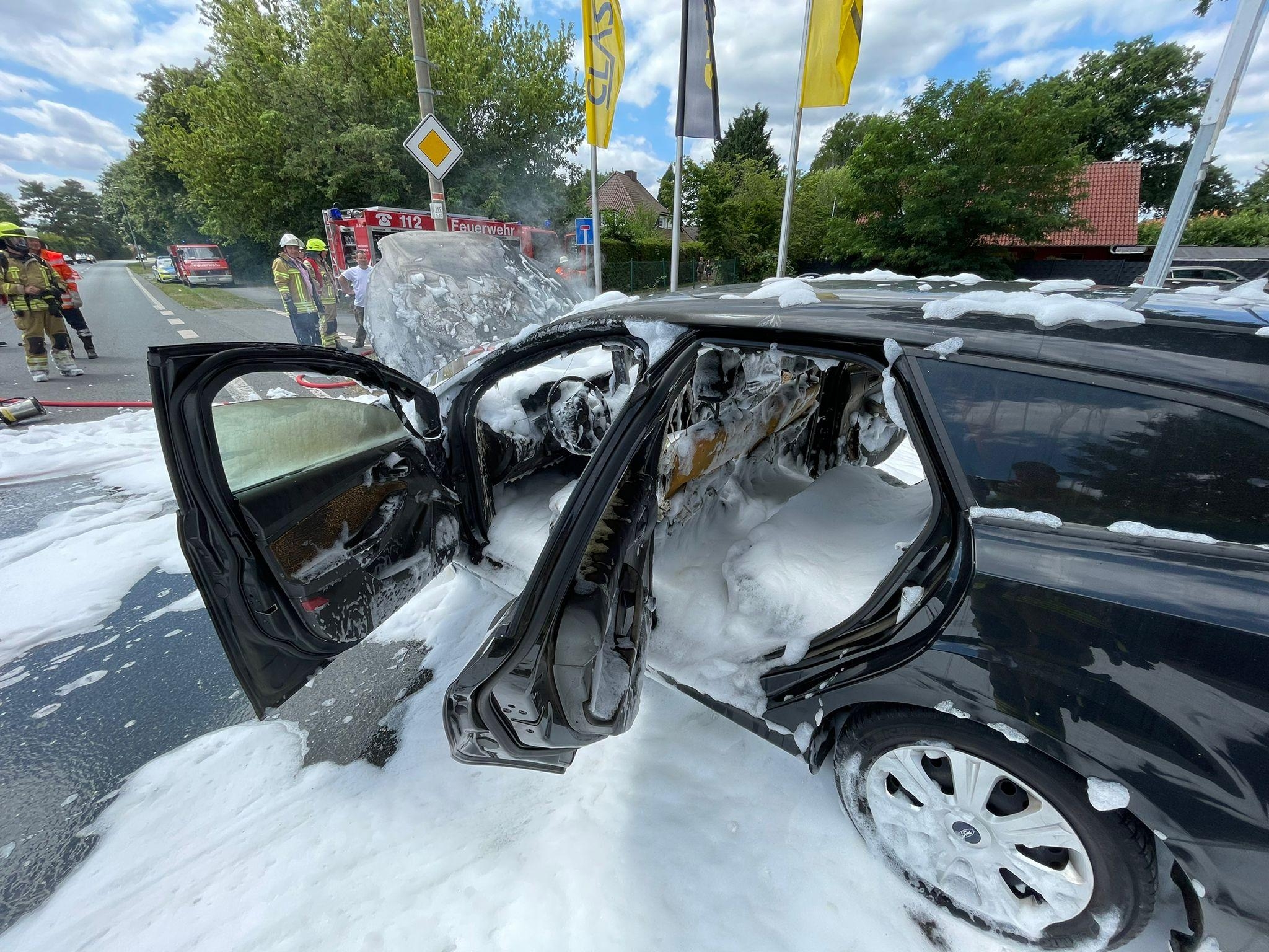 (Leeseringen) Ein technischer Defekt an einem PKW, in dessen Folge dieser in Flammen aufging, beschäftigte in den Mittagsstunden des heutigen Samstags die Feuerwehren Estorf und Leeseringen. Auf Höhe der Leeseringer Tankstelle bemerkte die Fahrerin eines Ford Focus Brandgeruch und Rauch aus dem Motorraum und stoppte daraufhin ihr Fahrzeug. Schnell schaffte sie es noch, Gepäckstücke aus dem Kofferraum auszuladen. Kurze Zeit später stand der Wagen im Vollbrand. Durch die Feuerwehren wurde umgehend die Brandbekämpfung aus einem Tanklöschfahrzeug aufgenommen. Parallel wurde eine Wasserversorgung aus einem Unterflurhydranten in der Nähe aufgebaut. Als diese stand, wurde ein Schaumrohr zum ablöschen des Autos vorgenommen. Hierbei kam ein Angriffstrupp unter schwerem Atemschutz zum Einsatz. Die Flammen waren nach etwa 15 Minuten gelöscht. Die Aufräumarbeiten an der Einsatzstelle zogen sich noch etwa eine Stunde hin. In dieser Zeit war die B215 voll gesperrt. Am Fahrzeug entstand Totalschaden.