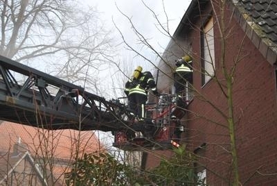 Am Dienstag morgen, gegen halb zehn, wurden die Ortsfeuerwehren aus Estorf, Landesbergen, Leeseringen, Nienburg und die Einsatzleitung Ort zu einem Dachstuhlbrand in die Schulstraße in Estorf gerufen. Beim eintreffen der Einsatzkräfte drang Qualm aus den Dachpfannen der linken Doppelhaushälfte. Die Feuerwehren bauten mehrere Wasserentnahmestellen auf und die Drehleiter aus Nienburg wurde in Stellung gebracht. Nachdem die Haustür durch die Feuerwehr geöffnet wurde gingen mehrere Trupps unter Atemschutz zur Erkundung vor. Zeitgleich wurde, über die Drehleiter und Steckleiter, sich Zugang über die im Giebel befindlichen Fenster verschafft. Ein Hochdrucklüfter wurde vor dem Haus in Stellung gebracht, um die Wohnung Rauchfrei zu bekommen. Mit der Wärmebildkamera suchte man nach Brandnestern in den Leichtbauwänden sowie in den Zwischendecken aus Holz. Da die Lage noch unklar war, wurden vorsichtshalber die Feuerwehren aus Leese und Schessinghausen nachalarmiert, um genügend Atemschutzgeräteträger vor Ort zu haben.