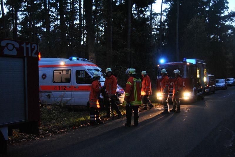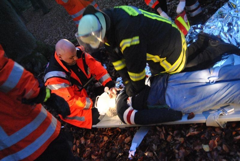 Mit diesem Einsatzstichwort wurde die Freiwillige Feuerwehr Leeseringen um 16.30 Uhr per Funkmeldeempfänger und Sirene alarmiert. Ein Jagdpächter, der zufällig im Revier unterwegs war, fand einen Jagdkollegen auf einem Hochsitz bewusstlos vor. Sofort setzte der Jäger einen Notruf zur Leitstelle ab. Der eintreffende Rettungswagen konnte die Einsatzstelle direkt im Wald, ca. 600 Meter von der festen Straße entfernt, nicht anfahren, da der Waldweg durch den Regen stark aufgeweicht war. Deswegen veranlassten die Sanitäter über die Leitstelle die Alarmierung der Feuerwehr Leeseringen zur Unterstützung. Als die Einsatzkräfte am Waldweg zwischen Leeseringen und Schessinghausen eintrafen, mussten die Feuerwehrleute zuerst sämtliches Gerät, welches am Hochsitz benötigt wurde, in den Wald tragen. Zusammen mit den Sanitätern wurde der Jäger vom Hochsitz gerettet und noch im Wald wiederbelebt. Da es langsam dunkel wurde, musste noch ein Notstromaggregat und Beleuchtungsgerät in den Wald geschafft werden. Nun galt es noch die Person, die an ein Beatmungsgerät angeschlossen war, mit einer Trage aus dem Wald zum Rettungswagen zu bringen. Die scharfe Schusswaffe hatte der Jagdpächter gleich an sich genommen und gesichert. Am Ende der Übung musste sämtliches feuerwehrtechnische Gerät, das im Wald benötigt wurde, ebenso wieder zu den Feuerwehrfahrzeugen zurück getragen und verladen werden. Ortsbrandmeister Bernd Thieheuer zeigte sich durchweg zufrieden mit dem, was die 15 Einsatzkräfte, die mit 2 Feuerwehrfahrzeugen und einem Rettungswagen der Johanniter-Unfall-Hilfe vor Ort waren, geleistet haben und wies darüber hinaus auf die Gefahren bei solch einem Einsatz bezüglich der Waffe hin.