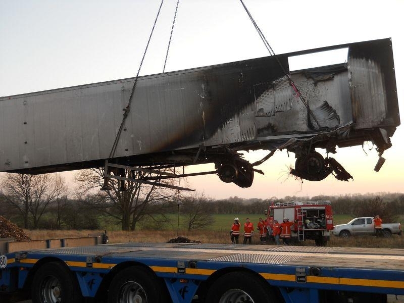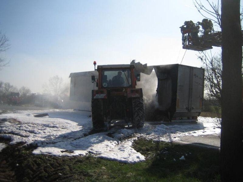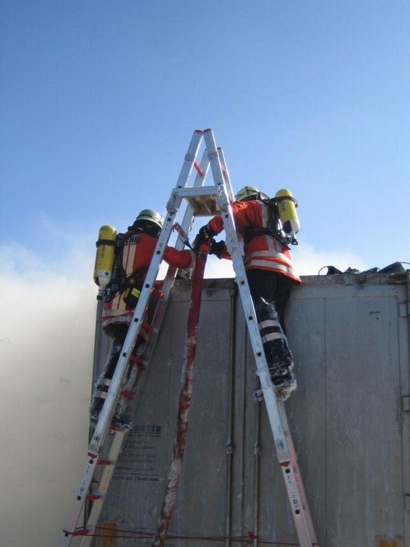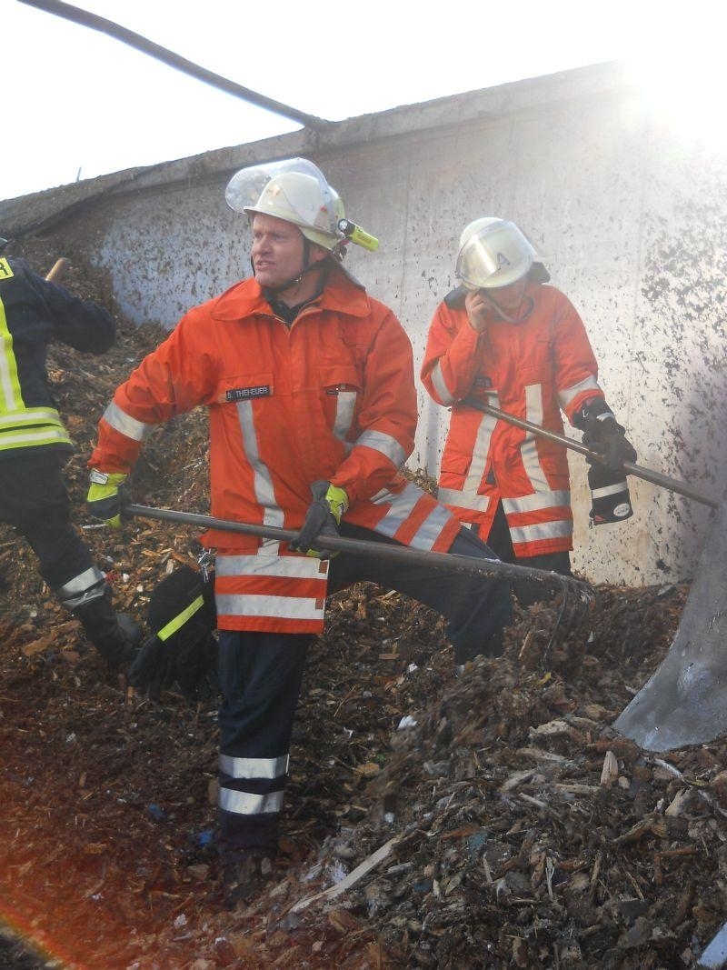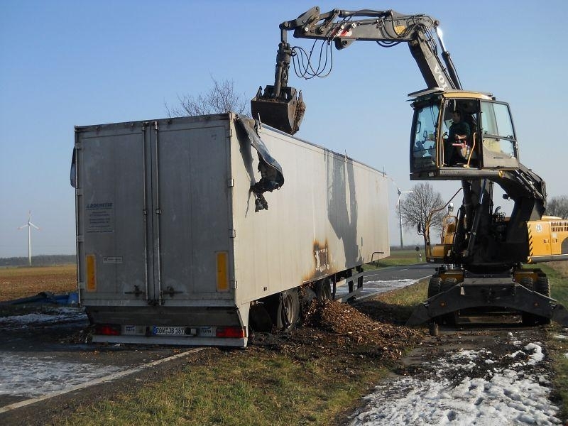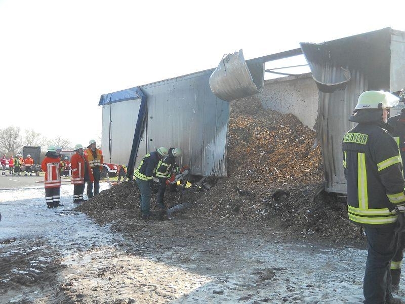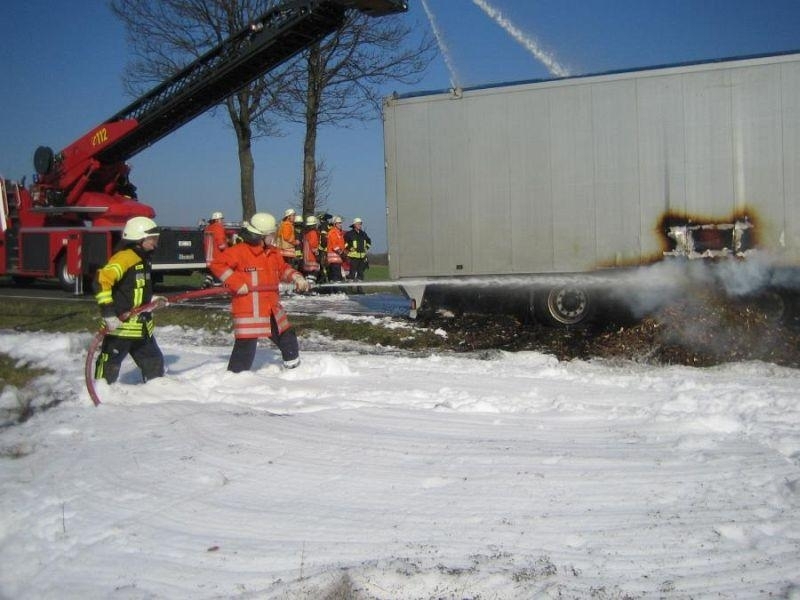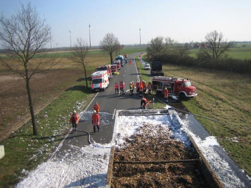 Den zuerst eintreffenden Einsatzkräften aus Landesbergen bot sich folgende Lage: Der mit Holzhackschnitzeln beladene Auflieger des LKW stand in Flammen, die Rauchsäule war bereits von weitem deutlich sichtbar. Doch auch der sofort eingeleitete Schaumangriff unter schwerem Atemschutz konnte das Übergreifen der Flammen auf die leicht brennbare Ladung nicht mehr verhindern. Sofort wurden die Ortsfeuerwehr Leeseringen und die Drehleiter aus Nienburg nachgefordert. Da sich jedoch auch die Wasserversorgung entlang der B215 aufgrund der langen Wegstrecke als schwierig gestaltete, ließ die Einsatzleitung unter Führung des stellvertretenden Gemeindebrandmeisters Andreas Haake auch die Ortswehren Husum und Stolzenau mit ihren Tanklöschfahrzeugen anrücken. Zur Brandbekämpfung öffneten die Einsatzkräfte schließlich das Dach des Aufliegers, um diesen mit Schaummittel zu fluten und den Brand zu ersticken. Um den enormen Bedarf an Schaummittel zu decken, rückten auch die Kameraden des ABC-Zuges Nienburg mit dem Abrollbehälter Schaum zur Einsatzstelle an. Zudem war auch ein Rettungswagen des DRK Landesbergen zur Absicherung der über 60 Einsatzkräfte über die gesamte Dauer hinweg vor Ort.