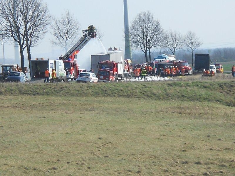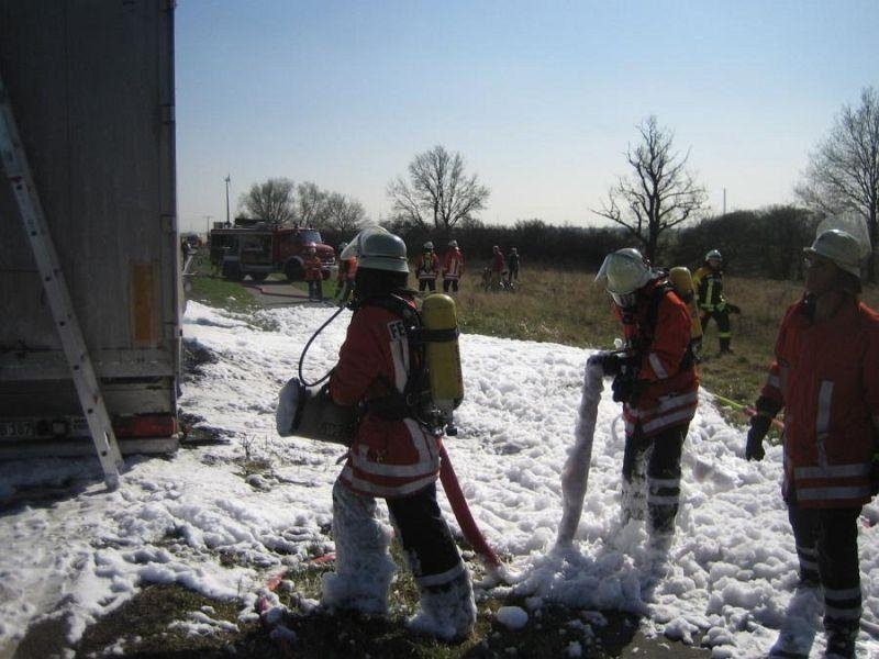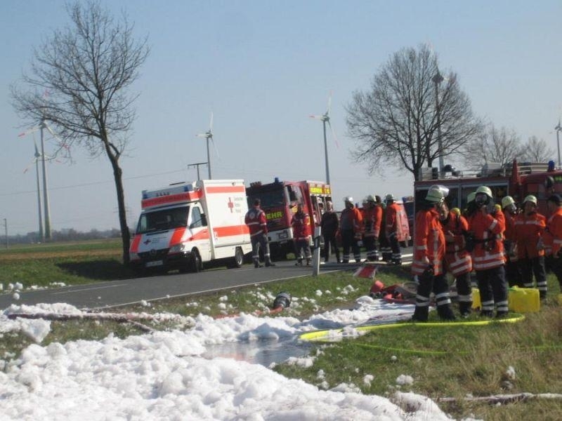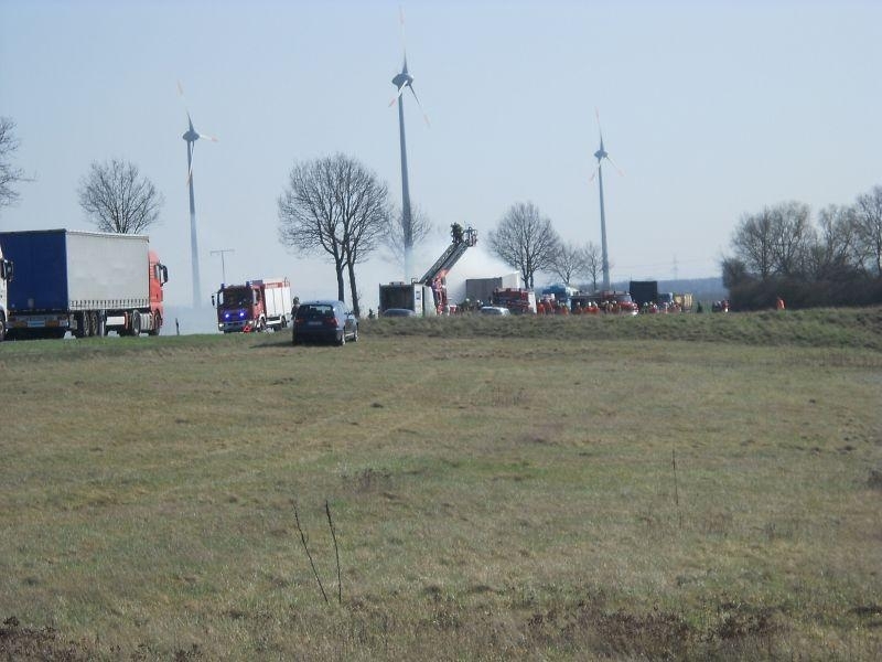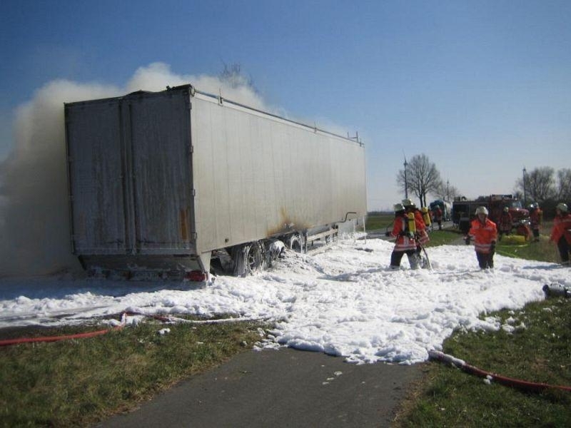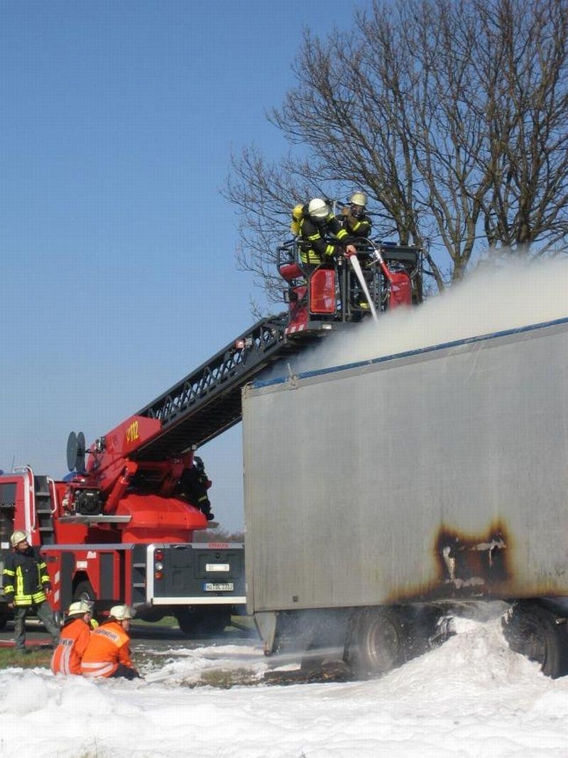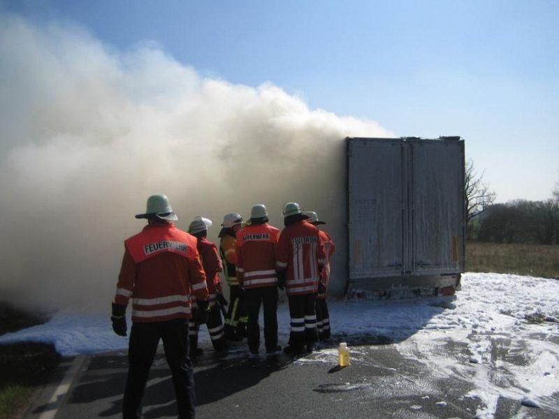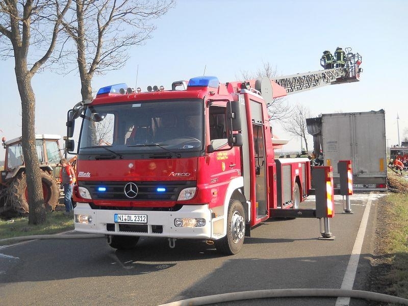 Als am frühen Nachmittag des 28.03. die Sirenen in Landesbergen und Leese die Ortsfeuerwehren auf den Plan riefen, erahnte wohl keiner der anrückenden Kameraden das Ausmaß des folgenden Einsatzes. Zwischen Landesbergen und Estorf hatte der Fahrer Lastkraftwagens einen Reifenbrand an seinem Fahrzeug bemerkt. Umgehend trennte er den Auflieger von der Zugmaschine und alarmierte per Telefon die Feuerwehr.