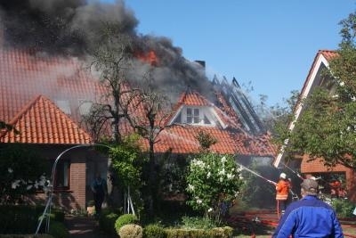 Am Sonntagnachmittag um 16.16 h entdeckten die Hausbesitzer Rauchentwicklung im Dach ihres Wohnhauses. Die Feuerwehr Leeseringen unter Leitung ihres Ortsbrandmeisters Bernd Thieheuer rückte sofort an. Schon auf der Anfahrt zur Straße Ortfeld 9 war die Größe des Feuers durch eine gewaltige Rauchsäule zu sehen. Sofort wurden die Wehren Estorf, Landesbergen und Leese nachgefordert, dazu das Einsatzleitfahrzeug aus Husum. Der Dachstuhl des Anbaus brannte in voller Ausdehnung, das Feuer griff auch auf das Hauptgebäude über. 6 Trupps unter Atemschutz versuchten in das Gebäude zu gelangen. Wegen der starken Verqualmung waren die Löschmaßnahmen erst nur von außen möglich. Deshalb wurde die Nienburger Drehleiter nachgeordert. Erst nach dem Abtragen der Dachziegel konnte gezielt gegen die Flammen vorgegangen werden. Nach Einschätzung des Gemeindebrandmeisters Andreas Haake waren ca 120 Wehrleute im Einsatz. Zur Absicherung der Geräteträger und weil das Besitzerehepaar unter dem Schock des Erlebten stand, wurde ein Rettungswagen nachgeordert. Um die hohen Flammen einzudämmen, war eine enorme Wassermenge aus 6 Rohren nötig. Der Brand, Wassereinwirkung und Abdecken des Daches haben einen enormen Schaden angerichtet. Zumindest die rechte Haushälfte ist zerstört, das Wohnhaus erstmal unbewohnbar. Die Feuerwehr Langendamm suchte dann gezielt nach noch vorhandenen Glutnestern.