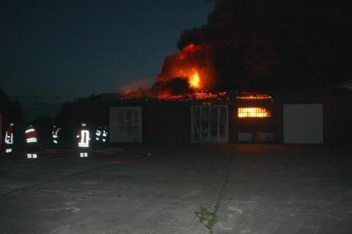 Die Feuerwehren der Samtgemeinde Landesbergen mussten den 3. Nachteinsatz in den letzten 6 Tagen ableisten. Nach einem PKW Brand in Husum und dem Feuer in der Leeseringer Recyclinganlage kam es nun zu einem Großbrand in Landesbergen. Am Montagmorgen um 3.41 h stand das Gebäude eines Schaustellerbetriebes in der Bahnhofstraße in Vollbrand. Beim Eintreffen der Landesberger Wehrleute schlugen die Flammen schon aus dem Dach des Gebäudes. Die riesige Rauchsäule war von Leese aus zu sehen. Das massive Stahltor musste erst aufgebrochen werden, um an den Brandherd zu gelangen. Ortsbrandmeister Wolfgang Schöning forderte sofort Löschhilfe an. Die Wehren Leese, Husum, Brokeloh, Schessinghausen, Leeseringen, Estorf und Nienburg mit der Drehleiter trafen kurze Zeit später ein. Ca 100 Feuerwehrleute nahmen die Brandbekämpfung von allen Seiten des Gebäudes auf. Die Kreisstraße nach Brokeloh musste für mehrere Stunden voll gesperrt werden. Der beginnende Berufsverkehr kam zum Erliegen.