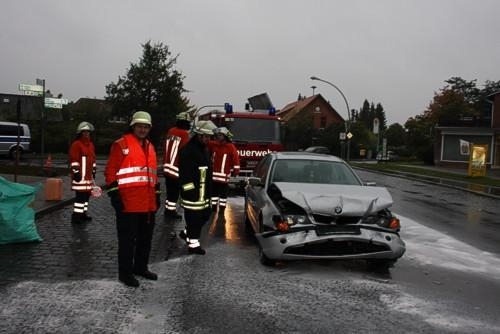 Am Dienstagnachmittag herrschte um 17.45 h Dauerregen und starker Wind. Der Fahrer eines Nienburger VW Bora Kombi musste auf der B 215 verkehrsbedingt im Ort Leeseringen anhalten. Eine 47 jährige Fahrerin aus Landesbergen fuhr mit erheblicher Geschwindigkeit auf den vor ihr stehenden VW auf. Bremsspuren waren nicht zu erkennen. Der Aufprall war so heftig, dass die Airbags des 3er BMW auslösten. Gegenüber den Polizeibeamten gab sie an, keine Erinnerung an den Vorgang zu haben. Beide Fahrzeuge wurden so heftig beschädigt, dass von 2 Totalschäden ausgegangen werden muß. Der finanzielle Schaden ist sicherlich sehr hoch. Die Feuerwehr Leeseringen musste unter Leitung von Ortsbrandmeister Bernd Thieheuer bei strömendem Ragen die Bundesstraße halbseitig sperren, um auslaufendes Öl und Betriebsstoffe zu binden. Der Ölfilm drohte mit dem vielen Regenwasser in die Kanalisation zu laufen. Beide Fahrer lehnten das Angebot der Polizei, Rettungswagen zu rufen zuerst ab. Als dann die Schockwirkungen eintraten, wurden beide von Verwandten in ärztliche Behandlung gebracht. Im Ort Leeseringen entstand im Feierabendverkehr durch die Sperrungen schnell ein langer Stau. Alle waren froh, dass der Unfall trotz des hohen Sachschadens mit nur leichteren Blessuren abgelaufen ist.