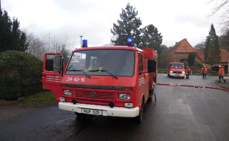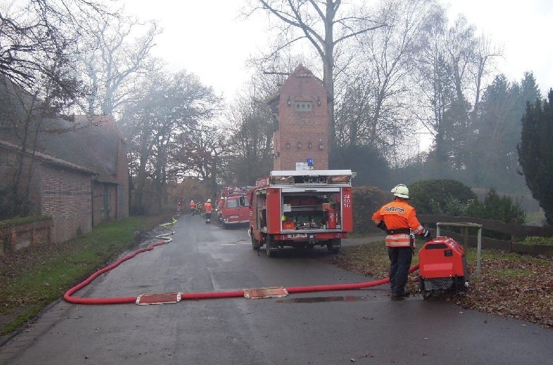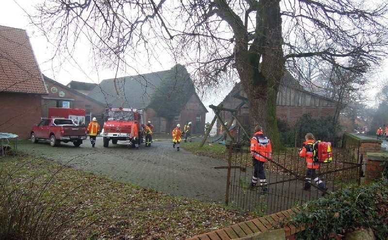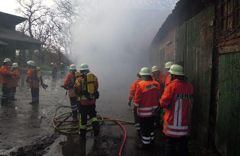 Bereits auf der Anfahrt vermeldete die Leitstelle eine Rauchentwicklung aus dem Heulager der Hofstelle, zudem wurden mehrere Personen vermisst. Zügig rüsteten sich erste Trupps unter schwerem Atemschutz aus, während weitere Einsatzkräfte die Wasserversorgung der Einsatzstelle sicherstellten. Den Atemschutztrupps gelang es schließlich, die vermissten Personen nacheinander aus dem Gebäude zu retten und an den Rettungsdienst zu übergeben. Nach etwa zwei Stunden waren auch die letzten Aufräumarbeiten beendet und die Kameraden wärmten sich während der anschließenden Manöverkritik bei warmem Früchtepunsch in der Scheune der Hofstelle auf, bevor sie alle in den Feierabend entlassen werden konnten.