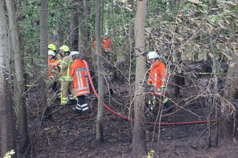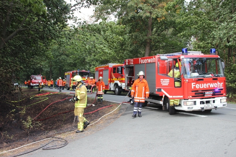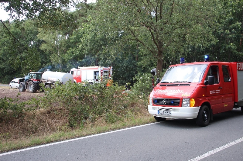 Aufmerksame Autofahrer alarmierten die Feuerwehr am Freitag gegen 15 Uhr zu einem Waldbrand an der L 370 zwischen Husum und Rehburg. Mit dem Einsatzstichwort „Flächenbrand – Mittel“ wurden die Feuerwehren aus Bolsehle, Linsburg, Brokeloh, Groß Varlingen, Husum, Leeseringen, Landesbergen, Rehburg, Nendorf und die Einsatzleitung Ort der Samtgemeinde Mittelweser alarmiert. Ein an die Bundesstraße L 370 angrenzendes Waldstück brannte auf einer Fläche von ca. 2.000m². Durch den schnellen Einsatz der Feuerwehren konnte ein weiteres Ausbreiten des Feuers verhindert werden. Sehr hilfreich war der Einsatz eines Güllefasses mit 12.000 Liter Wasser, dass durch einen Feuerwehrkameraden zur Einsatzstelle gebracht wurde. Der Wind aus westlicher Richtung sorgte dafür, dass das Feuer in Richtung Bundesstraße lief. Das Übergreifen auf das gegenüberliegende Waldstück konnten die Feuerwehren mit ihren 85 Einsatzkräften jedoch verhindern. Die Rauchentwicklung war zum Teil so heftig, dass die ersten Löschtrupps unter Atemschutz vorgehen mussten. Schon fünfundzwanzig Minuten nach der ersten Alarmierung wurde gemeldet, dass das Feuer unter Kontrolle ist. Um 16:30 Uhr hieß es dann Feuer aus. Alle Nachlöscharbeiten waren abgeschlossen. Die Wärmebildkameras zeigten keine Glutnester mehr an. Dann hieß es 30 B- Schläuche, 50 C- Schläuche, diverse D- Schläuche und Atemluftflaschen am Fahrzeug der Rufbereitschaft der FTZ zu tauschen. Ein Fahrzeug des Rettungsdienstes stand während des Einsatzes in Bereitschaft vor Ort. Die Polizei Nienburg hatte die L 370 für die Zeit des Einsatzes vollgesperrt.