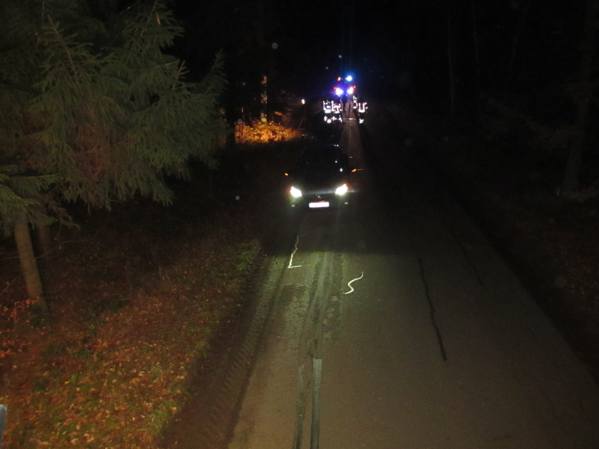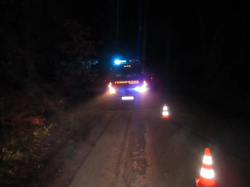 Ein PKW hatte im Waldstück zwischen dem Nienburger Bruch und Schessinghausen einen Unfall mit einem Tier. Der Fahrer vermutete, dass es sich um einen Wolf gehandelt haben könnte, welcher sich aber noch verletzt von der Unfallstelle in Richtung Wald entfernen konnte. Aufgrund der Schilderung des PKW-Fahrers und wegen auf der Straße befindlicher Blutspuren entschied der zuständige Jäger einen Wolfsberater hinzuzuziehen. Dieser wollte dann am Unfallfahrzeug Spuren des Tieres sichern und benötigte dafür eine umfangreiche Ausleuchtung der Umgebung, die von der Feuerwehr hergerichtet werden sollte. Ferner galt es die Straße gegen den Durchgangsverkehr abzusichern.