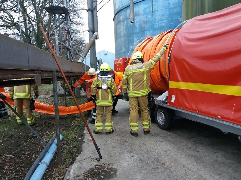 (Leeseringen) Die Feuerwehr Leeseringen sowie die Bootsgruppe der Kreisfeuerwehr Nienburg wurden am Mittwochvormittag gegen 10:40 Uhr an die Weser ins Leeseringer Industriegebiet zum dortigen Schiffsanleger gerufen. Ein unter tschechischer Flagge fahrendes Binnenschiff hatte dort festgemacht um seine Ladung zu entladen. Bereits in Höhe Mehlbergen hatten aufmerksame Anwohner den wahrscheinlichen Defekt am Schiff bemerkt, der dazu führte, dass eine ölhaltige Substanz am Heck des Schüttgutfrachters austrat. Die daraufhin alarmierte untere Wasserbehörde versuchte zunächst den Verursacher, der weiter Flussaufwärts unterwegs war, ausfindig zu machen. Hierzu wurde ein Hubschrauber der Polizei eingesetzt. Im Leeseringer Hafen galt es dann, eine weitere Ausbreitung des Öls zu verhindern. Die FTZ Nienburg brachte einen Anhänger mit einer für Fließgewässer geeigneten Ölsperre zur Einsatzstelle. Parallel fuhr das Mehrzweckboot des Landkreises die Einsatzstelle vom Wasserweg aus an. An Land wurde dann mit einigem Personaleinsatz die 60m lange Ölsperre über eine steile Treppe etwa 10 m tief die Böschung hinunter zur Wasserkante gebracht. Hier wurde sie vom Mehrzweckboot aufgenommen und zum Havaristen geschleppt, wo sie schließlich um die offensichtliche Ölaustrittsstelle herum befestigt wurde, um die Umweltgefahr einzudämmen. Für die eingesetzten Feuerwehrkräfte endete der Einsatz nach dem Ausbringen der Ölsperre nach gut zwei Stunden. Zur Ursache des Defekts konnten vor Ort noch keine Angaben gemacht werden.