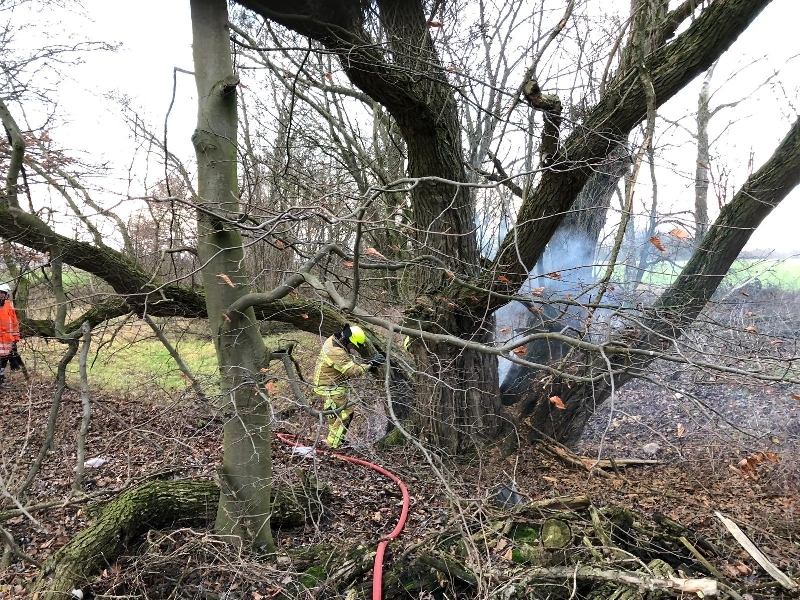(Estorf) Nach einem einsatzlosen Jahreswechsel für die Feuerwehren in der Samtgemeinde Mittelweser kam es am Neujahrsnachmittag zu einer Alarmierung der Ortsfeuerwehr Leeseringen. Aufmerksame Spaziergänger hatten einen stark qualmenden Baum in der Marsch zwischen den Ortsteilen Leeseringen und Estorf bemerkt. Nachdem die Einsatzstelle in einem abgelegenen kleinen Waldstück ausfindig gemacht werden konnte, begannen die Einsatzkräfte unter der Leitung von Ortsbrandmeister Bernd Thieheuer mit den Löscharbeiten. Die Glut hatte sich schon tief in den teils hohlen Baumstamm hineingefressen, weshalb dieser mit Hilfe einer Kettensäge geöffnet werden musste, um an alle Glutnester gelangen zu können. Mit einem C-Strahlrohr und 1800 Litern Löschwasser wurde der Baum dann abgelöscht. Der Einsatz, der offenbar durch den unsachgemäßen Umgang mit Silvesterböllern ausgelöst wurde, dauerte gut zwei Stunden. Da die Einsatzstelle im Ausrückbereich der Ortsfeuerwehr Estorf lag, machte sich auch Estorfs stellvertretender Ortsbrandmeister Jörn Vetter ein Bild von der Lage vor Ort. Ein weiteres Eingreifen der Estorfer Kameraden war allerdings nicht nötig.
